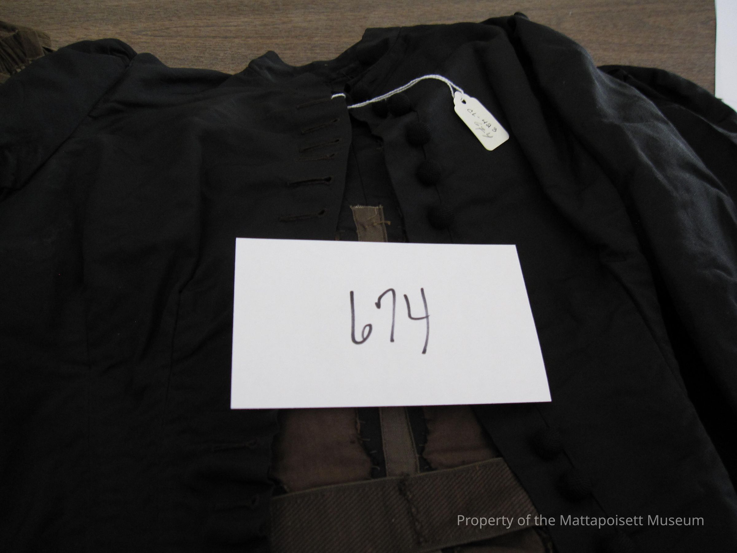 Notes: Notecard: Two-piece black taffeta dress. Skirt has heavy calamanco lining. Pleats down front. Top has black lace, trim at sleeves. Self covered buttons.