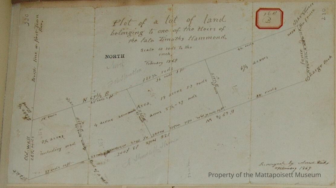 Plot of land belonging to one of the Heirs of the late Timothy Hammond. Scale 10 rods to the inch. February 1869. Four divisions totaling 19 acres, 87 rods: 4. 3 ½ acres, including road, 3. 4 acres, 2. 5 ½ acres and 17 rods, 1. 6 ¼ acres. J. B. Hamblin and A. Shurtleff Heirs abutting.Acquisition