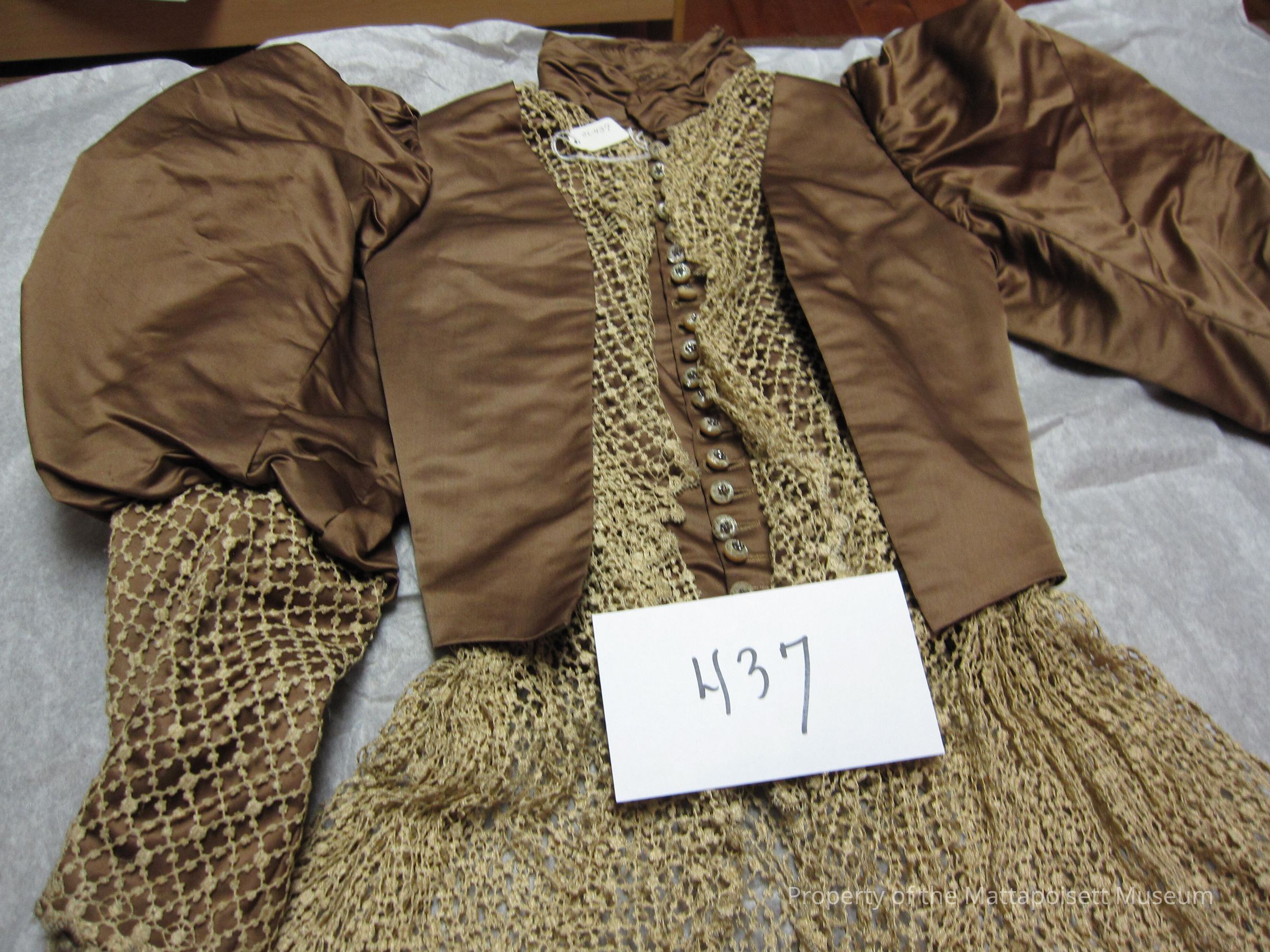Notes: Notecard: Waist, brown satin with tan lace peplum; tan lace on puff sleeves. Small pearl buttons with rhinestones, buttons down front, high collar.