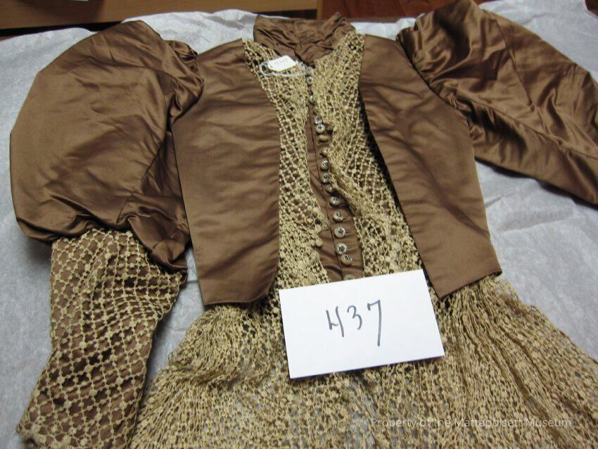 Brown satin waist with tan lace peplum. Tan lace trim on puff sleeves. Pearl buttons with rhinestones. Buttons down front. Mandarin/high collar. Leg-o-mutton sleeves. Circa 1890.Collection