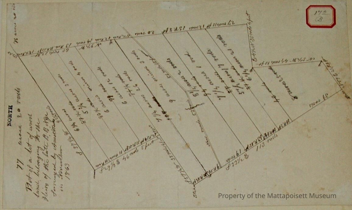 Plot of a lot of wood land belonging to the Heirs of the late B. B. Nye. Surveyed by Ansel Weeks in November 1863. Divided into 11 sections: 6 ¼ acres, 5 ¾ acres and 3 rods, 6 acres minus 4 rods, 6 acres and 12 rods, 7 ¼ acres and 26 rods, 9 acres minus 2 rods, 8 ¼ acres and 2 rods, 7 ¼ acres and 1 rod, 5 ½ acres and 17 rods, 6 ¼ acres and 21 rods, 8 acres and 25 rods. Section information in Notes.Acquisition
