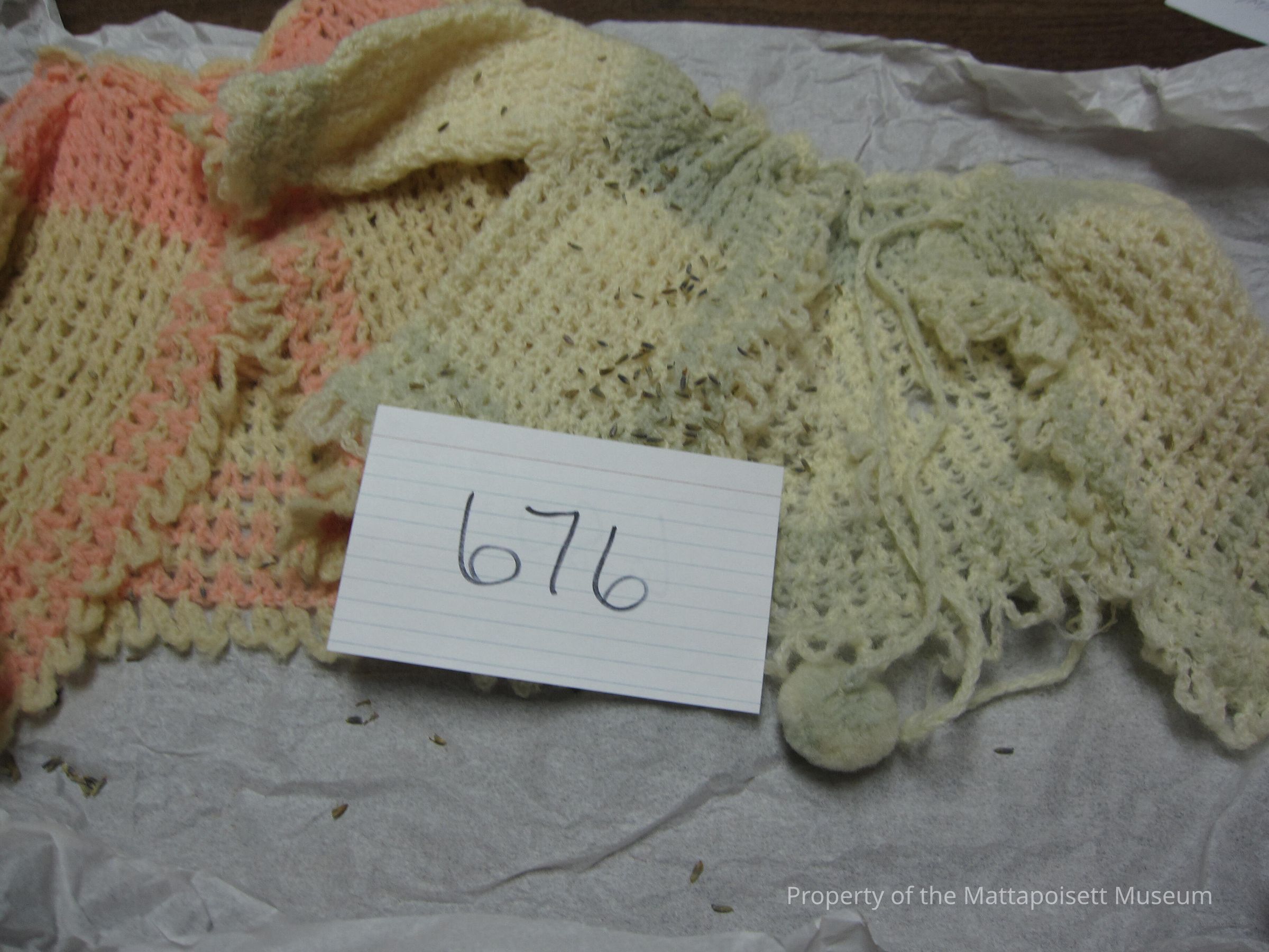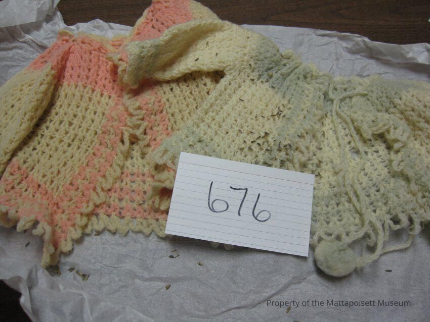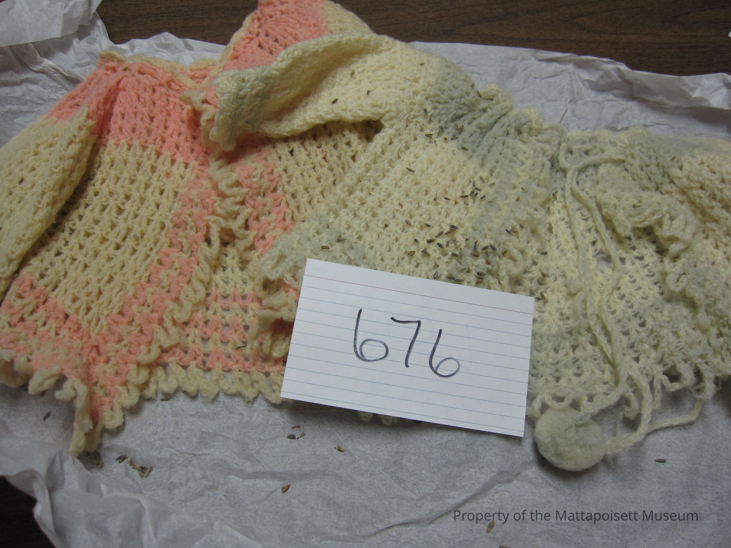 Notes: Notecard: Two-hand crocheted baby sweaters. (1) Pink, (1) Green.