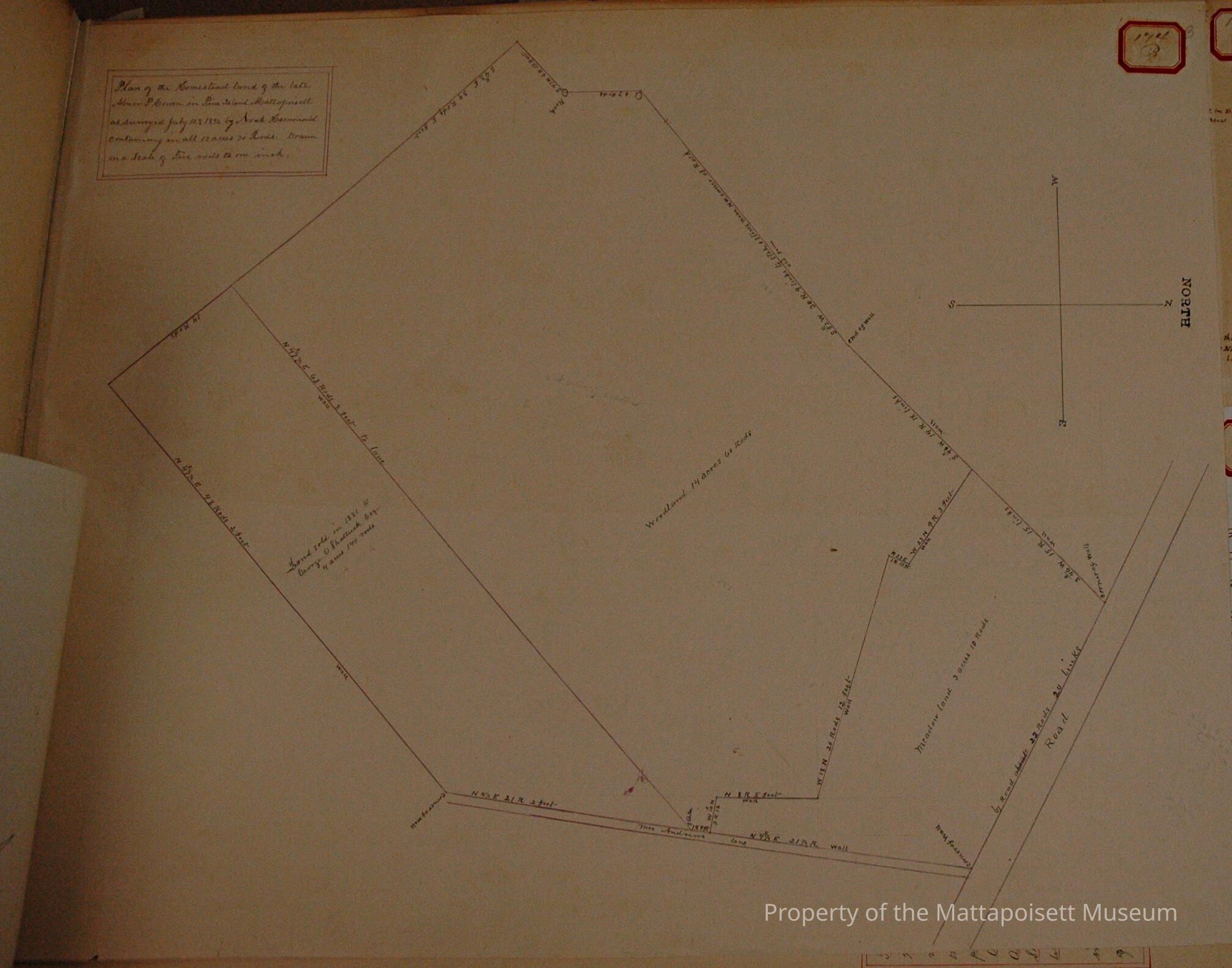 Plan of the Homestead land of the late Abner P. Cowen in Pine Island Mattapoisett as surveyed July 12th, 1892 by Noah Hammond. Containing in all 17 acres and 70 rods. Drawn on a scale of four rods to one inch.