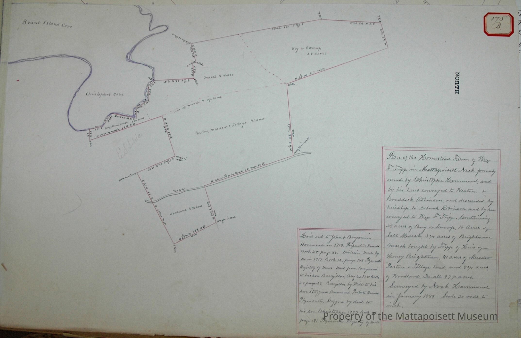 Plan of the Homestead farm of William F. Tripp in Mattapiosett Neck formerly owned by Christopher Hammond and by his heirs conveyed to Weston and Braddock Robinson and descended by heirship to Deborah Robinson and by her conveyed to William F. Tripp. Containing 28 acres of bog or swamp, 16 acres of salt marsh, 3 ¾ acres of Brightman marsh bought by Tripp of Heirs of Henry Brightman, 41 acres of meadow, pasture and sillage land and 8 ¾ acres of woodland. In all 97 ½ acres. Surveyed by Noah Hammond in January 1889. Scale 20 rods to one inch.