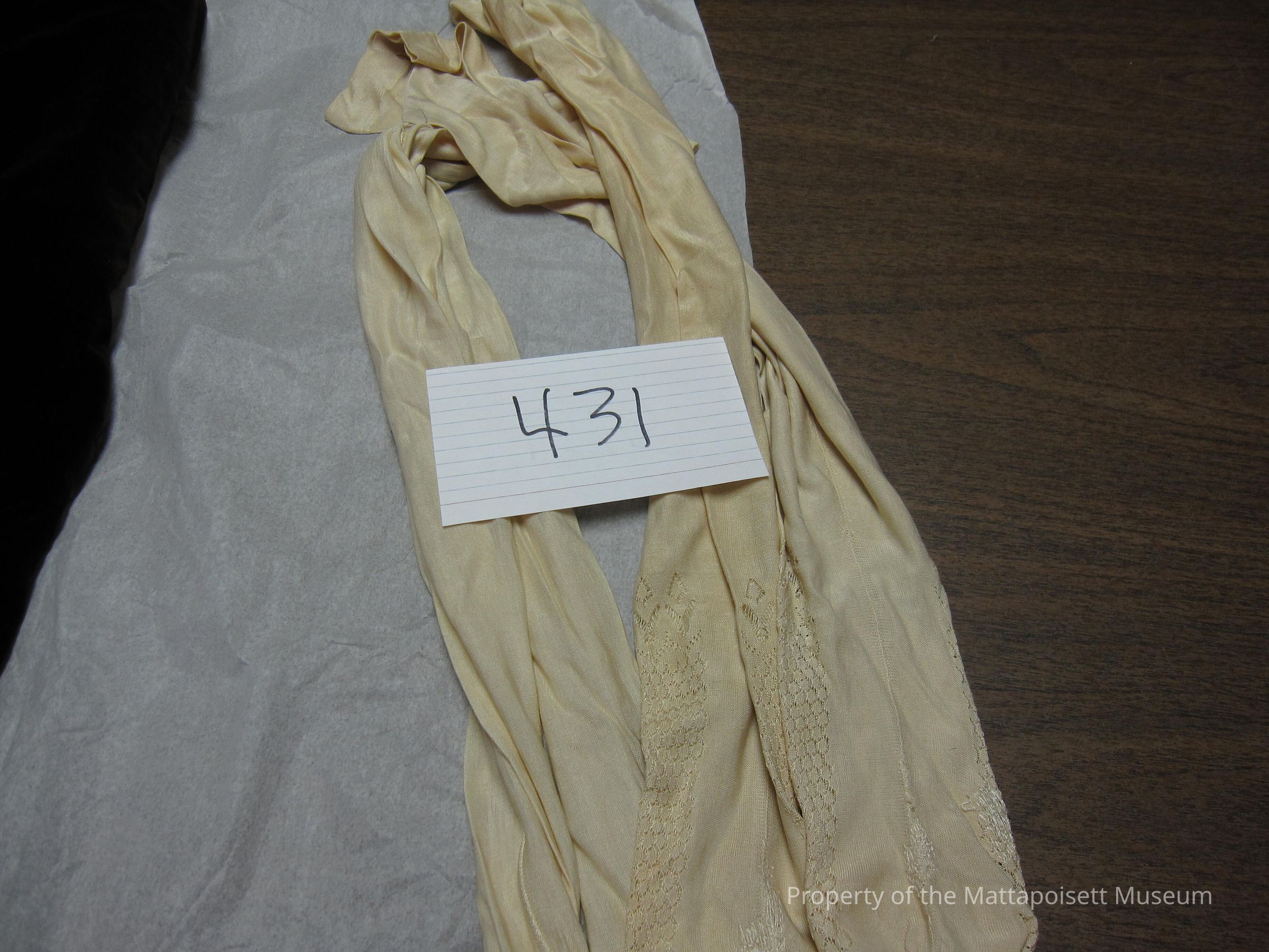 Notes: Notecard: 3 pair ecru silk stockings. some repair. wedding pair (1834)