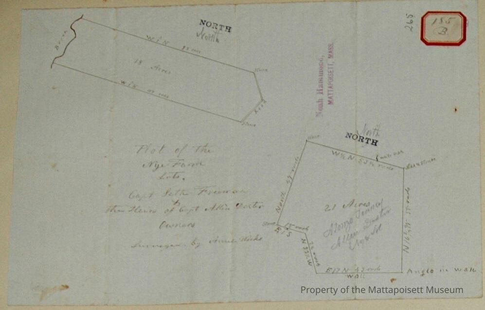 Plot of the Nye Farm Lots. Capt. Seth Freeman to then Heirs of Capt Allen Dexter, owners. Surveyed by Ansel Weeks. 21 acres of Alonzo Jenney Allen Dexter Nye lot. Also an 18 acre lot.Acquisition