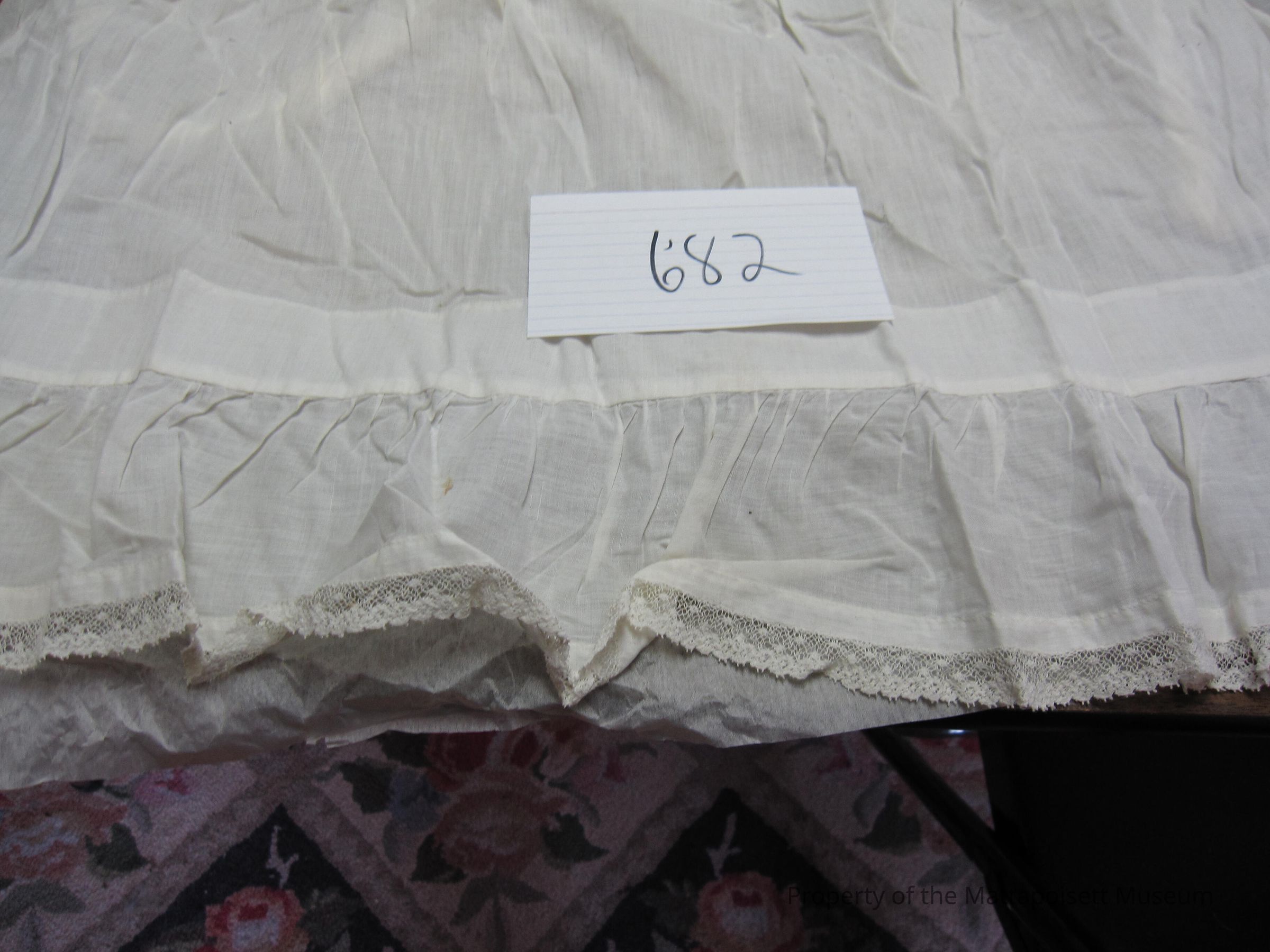 Notes: Notecard: Long white dimity apron.