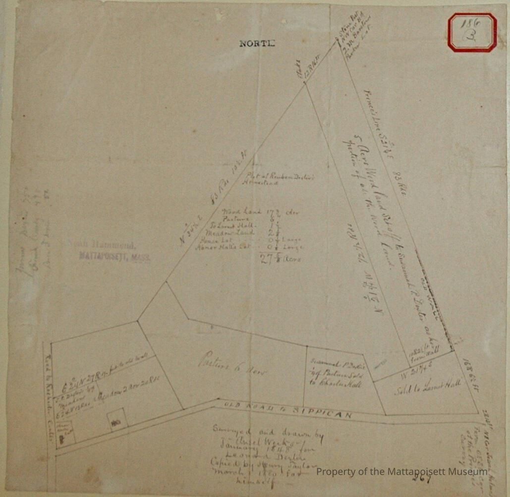 Plot of Reuben Dexter's Homestead. Woodland: 17 ¾ acres, pasture 6 acres, to Larnet Hall 1 ½, meadow land 2 1/8, house lot1/8 large, Abner Hall's lot 1/8 large (total 27 5/8 acres). On Roads to Rochester Center and Sippican (Marion). Surveyed and drawn by Ansel Weeks, January 1848 for Leonard Dexter, copied by Henry Taylor March 1880 for himself. 5 acres wood land set off to Susannah P. Dexter as her portion of all the wood land. Susannah P. Dexter's ¼ pasture sold to Charles Hall.Acquisition