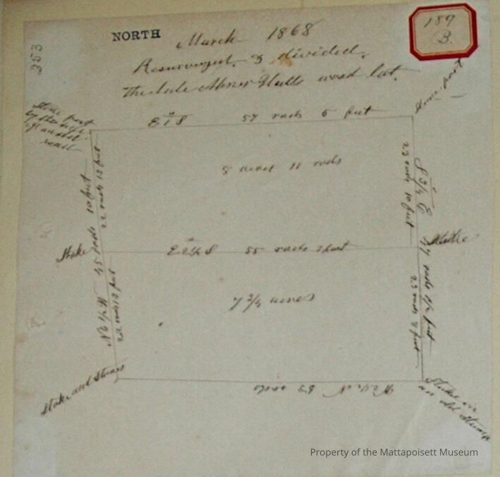 March 1868. Resurveyed and divided, the late Abner Hall's wood lot. Divided into two sections. 8 acres and 11 rods, 7 ¾ acres. Later owned by Joseph Dexter.Acquisition