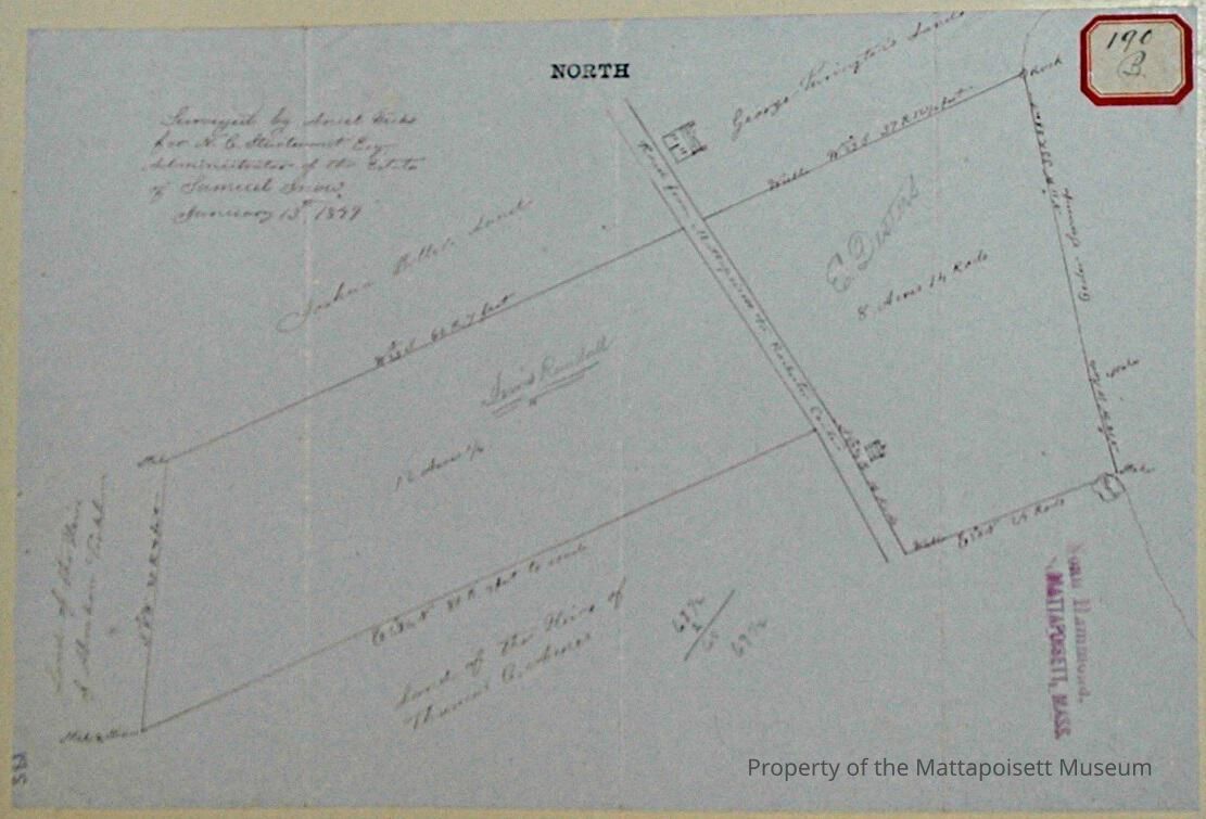 Surveyed by Ansel Weeks for N. C. Sturtevant, Esq., administrator of the estate of Samuel Snow. January 13th, 1847. John Bolles, Heirs of Thomas C. Ames, Heirs of Abraham Tinkham and George Purrington, abutters. Later Louis Randall and E. Dexter (in pencil). Road from Mattapoisett to Rochester Center runs through properties.Acquisition