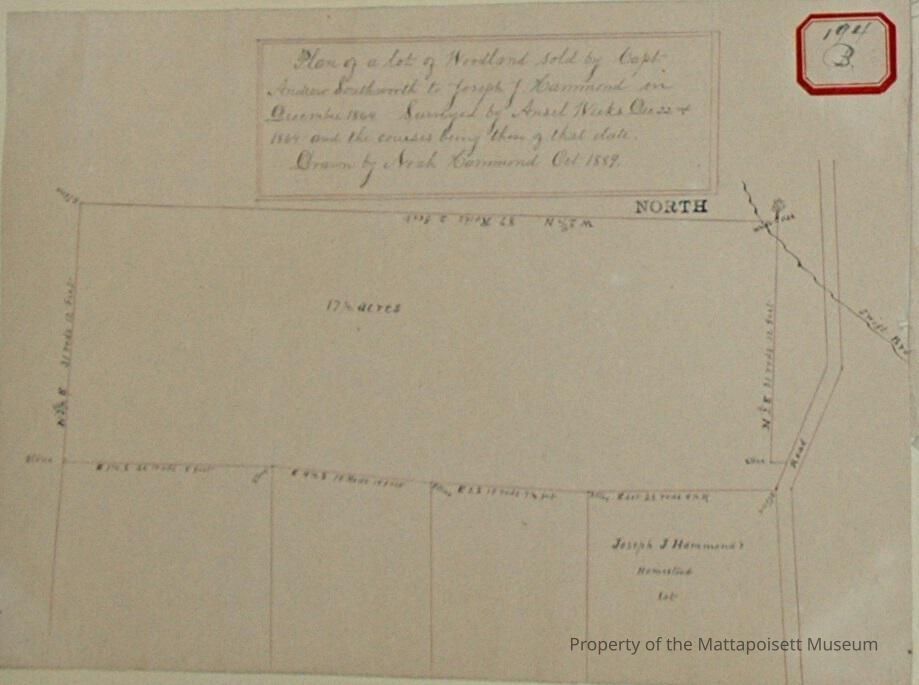 Plot of a lot of woodland sold by Capt. Andrew Southworth to Joseph J. Hammond in December 1869. Surveyed by Ansel Weeks December 22nd 1864 and the courses being these of that date. Drawn by Noah Hammond, October 1889. 17 ½ acre lot on road. Joseph J. Hammond's Homestead lot to the south.Acquisition