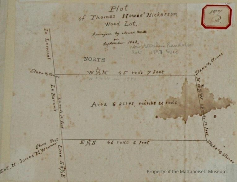 Plot of Thomas Howes' Nickerson wood lot. Surveyed by Ansel Weeks in September 1862. Area 6 acres minus 24 rods. Stephen Randall's lot in December 1897. Lemuel LeBaron and N. Jones abutting.Acquisition