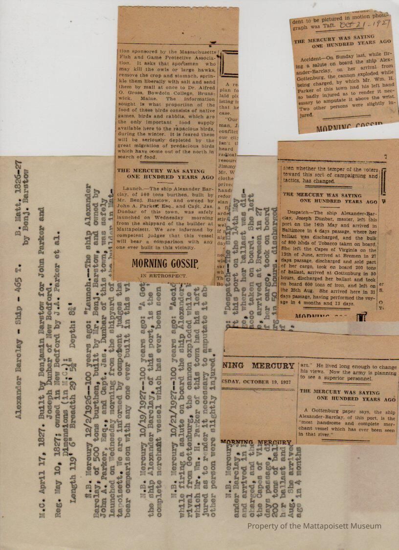 Ship "Alexander Barclay", typed notes, newspaper articles.Collection