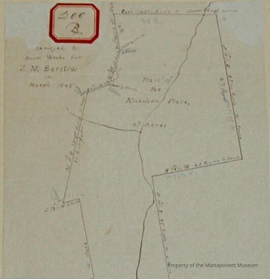Surveyed by Ansel Weeks for Z. M. Barstow in March 1845. Plan of the Nickelson Place, area 47 acres. Joseph Meigs, abutter.Acquisition