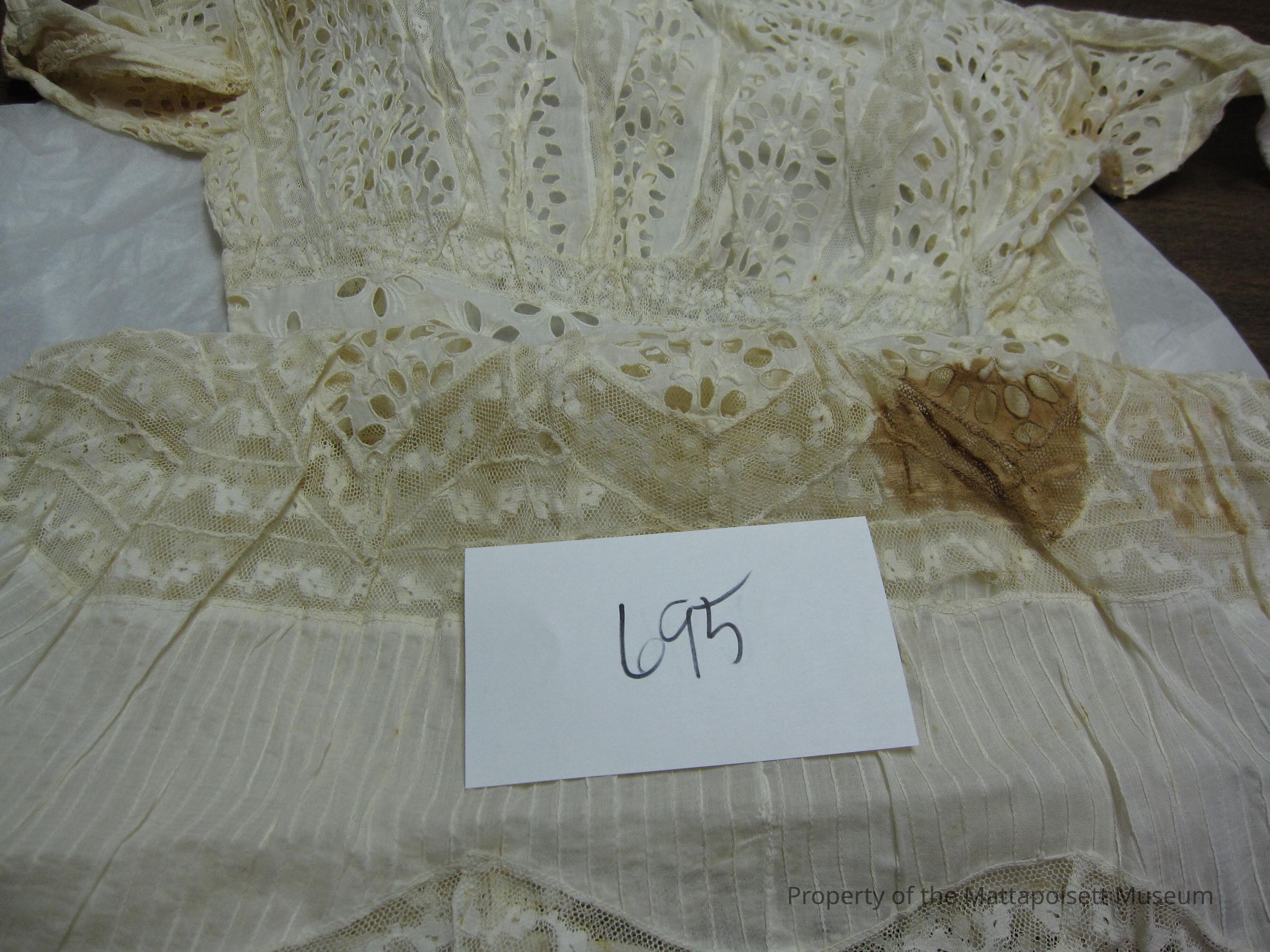 Notes: Notecard: Edwardian dress. Long white cotton, overall eyelet with lace inset down to hem.