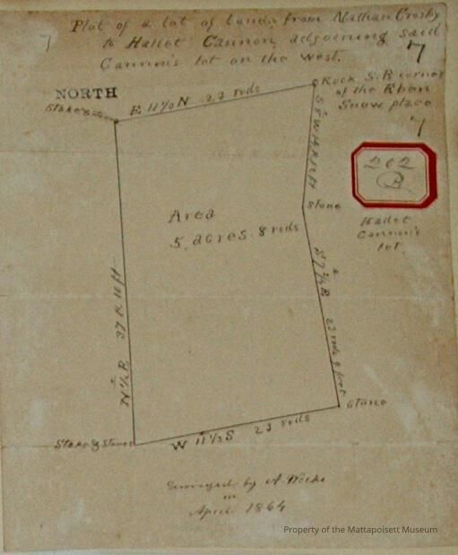 Plot of a lot of land from Nathan Crosby to Hallet Cannon adjoining said Cannon's lot on the west. Surveyed by Ansel Weeks in April 1864. Area 5 acres and 8 rods. Eben Snow, abutter.Acquisition