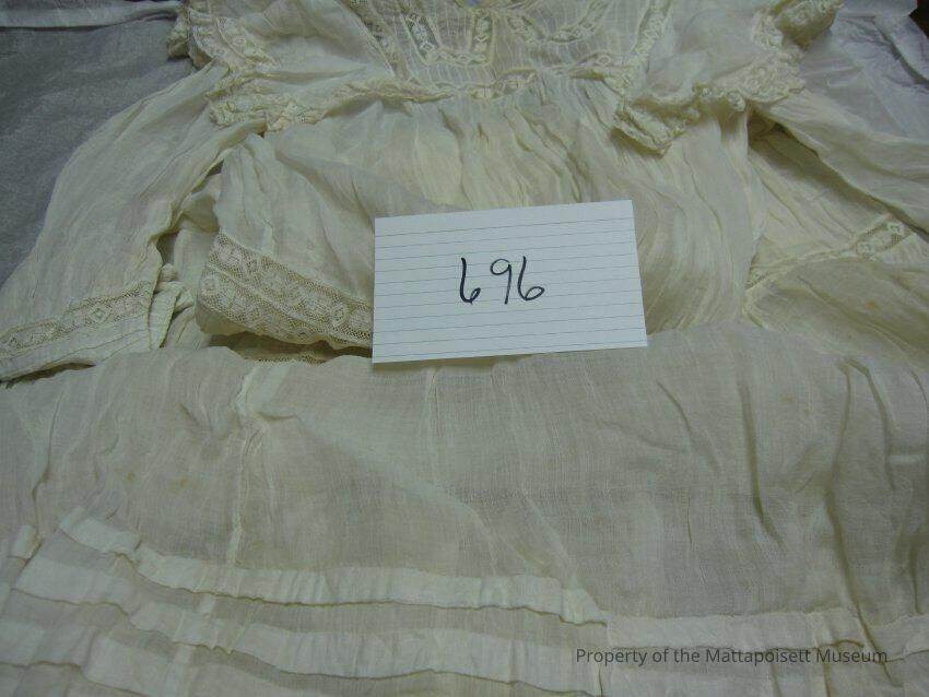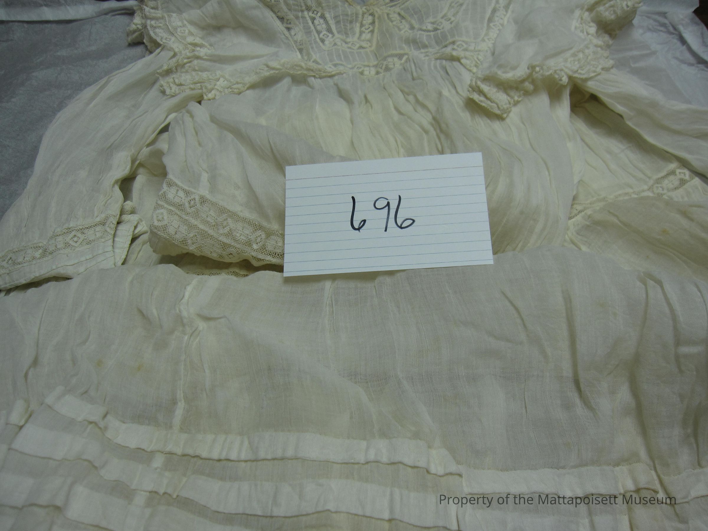 Notes: Notecard: Edwardian dress. Long white cotton, lace insets. Lace at collar and cuffs, pleats along hem.