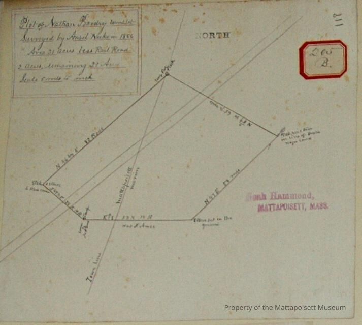 Plot of Nathan Boodry woodlot. Surveyed by Ansel Weeks in 1856. Area 31 acres less Railroad 2 acres. Remaining 29 acres. Scale 5 rods to the inch. Crossed by Mattapoisett and Marion town line and Railroad.Acquisition