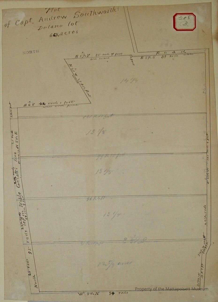 Plot of Capt. Andrew Southworth Delano lot. 66 ¼ acres. Divided into 5 sections at 14 ¼ acres, 13 1/8 acres, 13 1/8 acres 13 ¼ acres 12 5/8 acres. Noble Gelatt's line and Road border.Acquisition