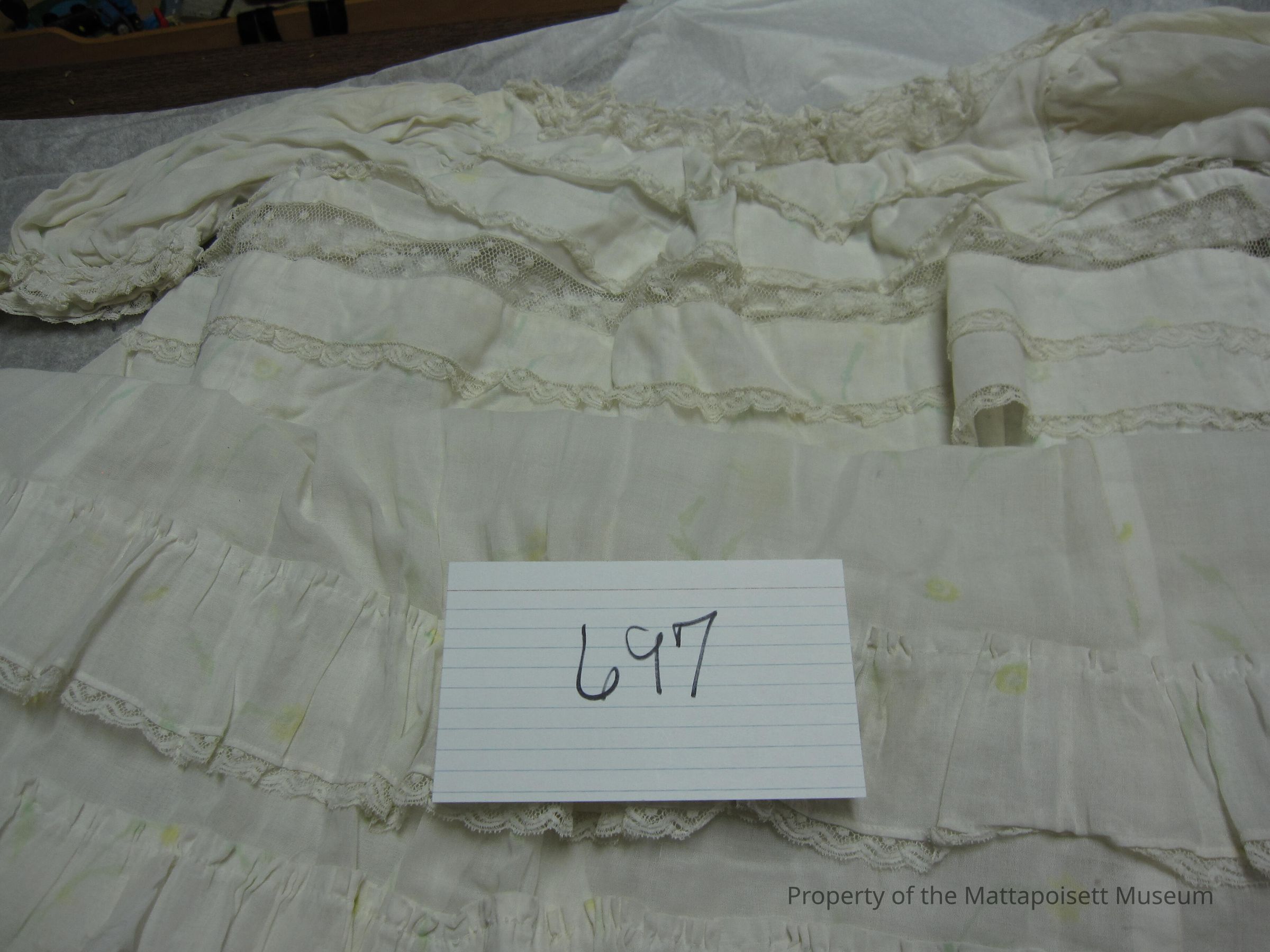 Notes: Notecard: Long white cotton dress with heavy lace trim, stays in bodice. Overall faint pattern of yellow and green flowers.