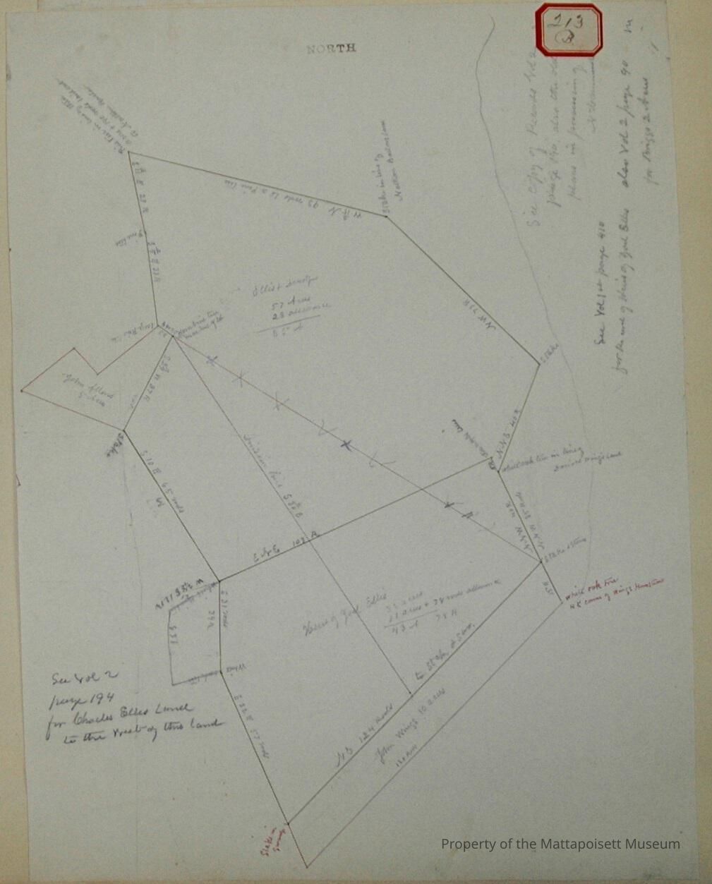 See vol. 2, page 194 for Charles Ellis land to the west of this land. See Vol. 1, page 410 for the of Heirs of Joel Ellis (43 acres and 78 rods). Also vol. 2 page 90 for Briggs' 2 acres. Ellis and ? 85 acres. See copy of records vol. 2 page 190 also the old plans in processing. N. Hammond. John Wings' 10 acres.Acquisition