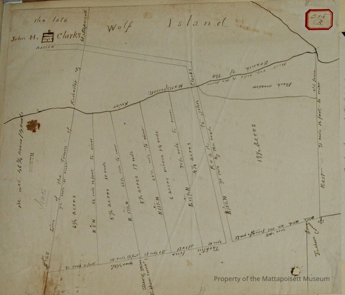Wolf Island. In all 46 ¾ acres, 14 rods. The late John H. Clark's house with road to John Clark's. Branch of Mattapoisett River, Town line of Rochester/Mattapoisett, Tinkham border. Divided into 6 of 6 ¼ acres, 5 ¼ acres and 18 rods, 5 ½ acres and 17 rods, 6 acres minus 14 rods, 4 ¼ acres, 19 ½ acres.Acquisition