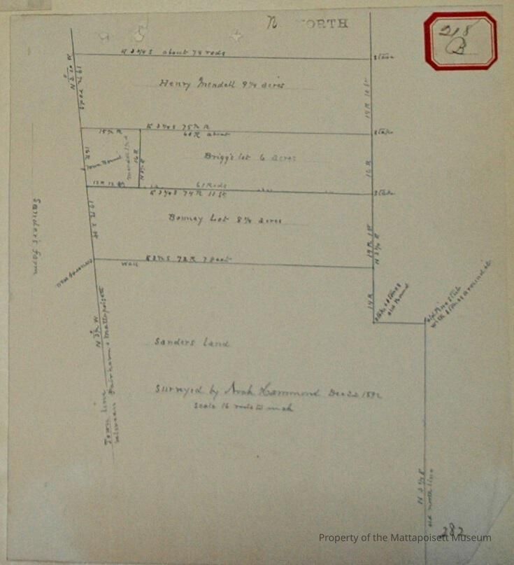 Surveyed by Noah Hammond, December 22, 1892. Scale 16 rods to the inch. Sanders land and farm border to the south and west. Bonney lot (8 ¼ acres), Briggs' lot (6 acres). Henry Mendell (9 ¼ acres). Mendell's 1 ½ acre. Fairhaven and Mattapoisett town line on west.Acquisition
