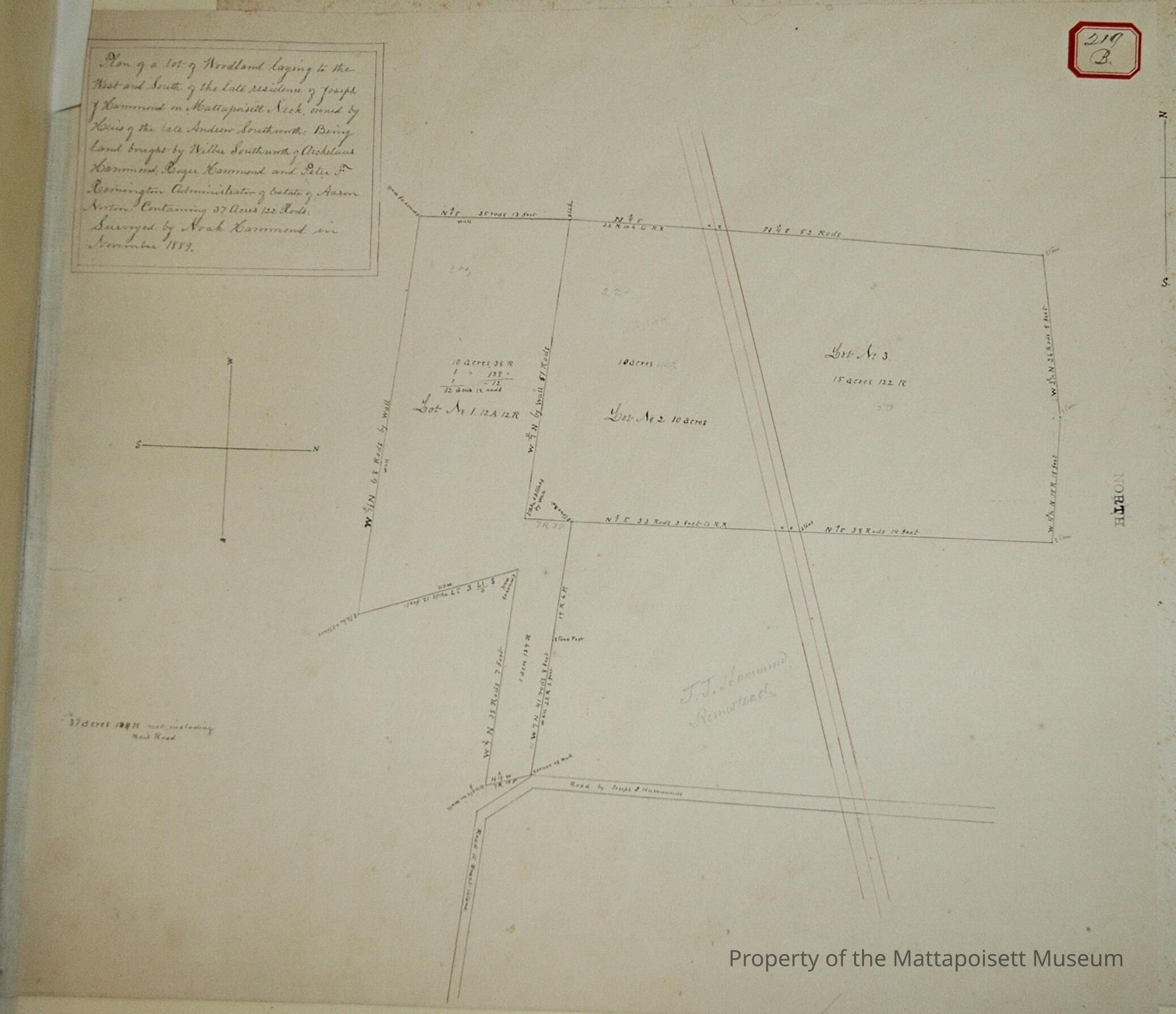 Plan of a lot of woodland laying to the west and south of the late residence of Joseph J. Hammond on Mattapoisett Neck, owned by Heirs of the late Andrew Southworth. Being land bought by Wilbur Southworth of Archelous Hammond, Roger Hammond and Peter F. Remington, Administrator of estate of Aaron Norton. Containing 37 acres and 122 rods (134 rods, not including Railroad pass through). Surveyed by Noah Hammond in November 1889. Divided into three lots, no. 1 12 acres and 12 rods, no. 2 10 acres, no. 3 15 acres and 122 rods. J. J. Hammond Homestead (in pencil), road by Joseph J. Hammond and road to Brandt Island border.Acquisition