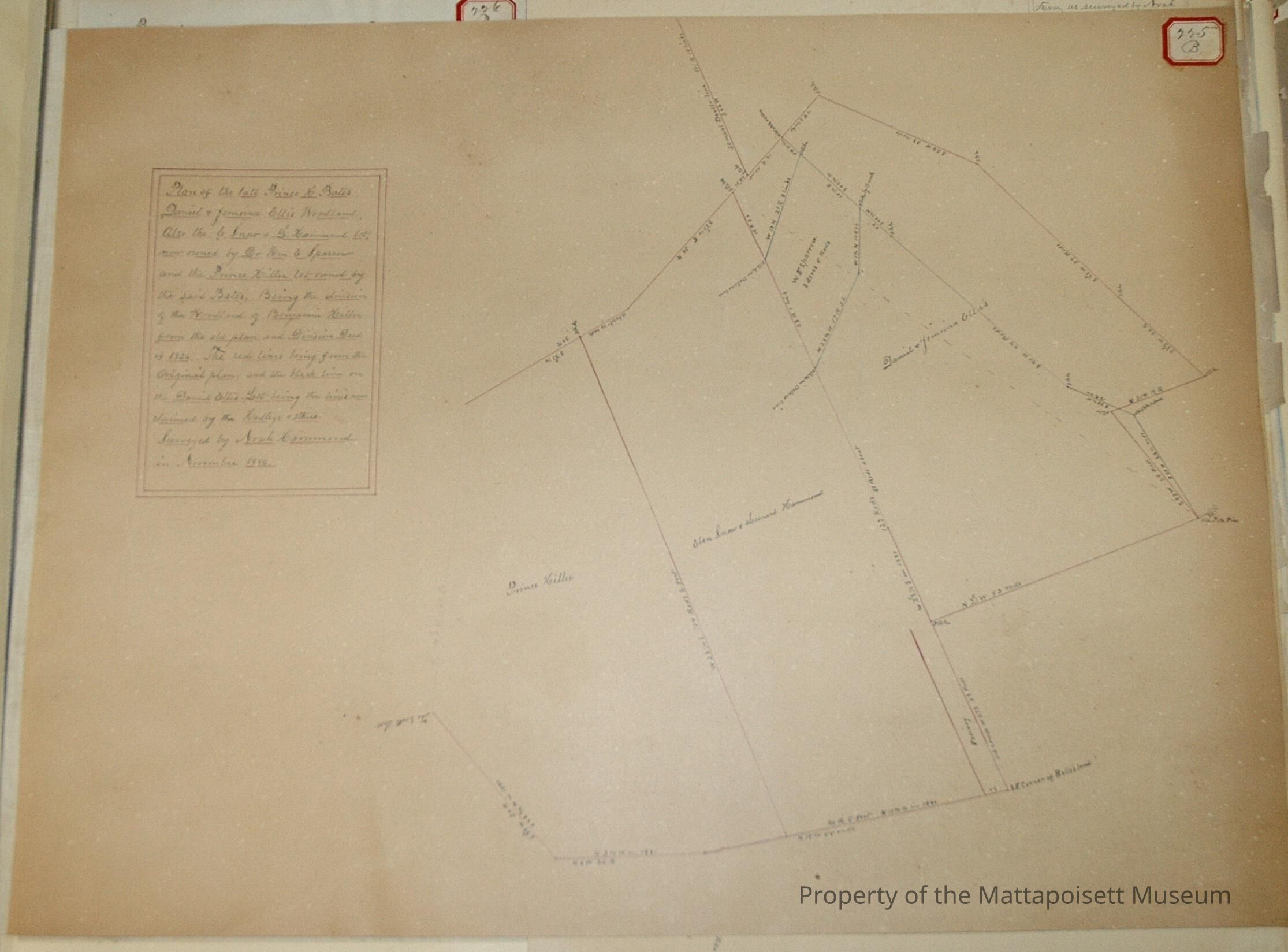 Plan of the late Prince H. Bates, Daniel and Jemima Ellis woodland. Also the E. Snow and L. Hammond estate now owned by Dr. William E. Sparrow and the Prince Hiller lot owned by the said Bates. Being the division of the woodland of Benjamin Hiller from the old plan and Division deed of 1826. The red lines being from the original plans, and the black line on the David Ellis lot being the claimed by the Hadley's and others. Surveyed by Noah Hammond in November 1886. Five divisions, Prince Hiller, Eben Snow and Leonard Hammond, David and Jemima Ellis (2) and W. E. Sparrow (3 acres and 5 rods). Bolles and Delano, abutters.Acquisition