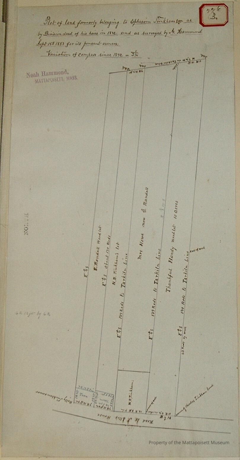 Plot of land formerly belonging to Ephraim Tinkham, Senior as by division deed of his heirs in 1842 and as surveyed by Noah Hammond September 15th, 1883 for its present owners. Variation of compass since 1842 = 0 over 2 ¼. On road to J. Ellis' house. E. Randall wood lot, N. B. Tinkham's lot (x2), Mrs. Howe, now G. Randall, Thankful Handy woodlot (10 acres). Charles Tinkham, abutter.Acquisition