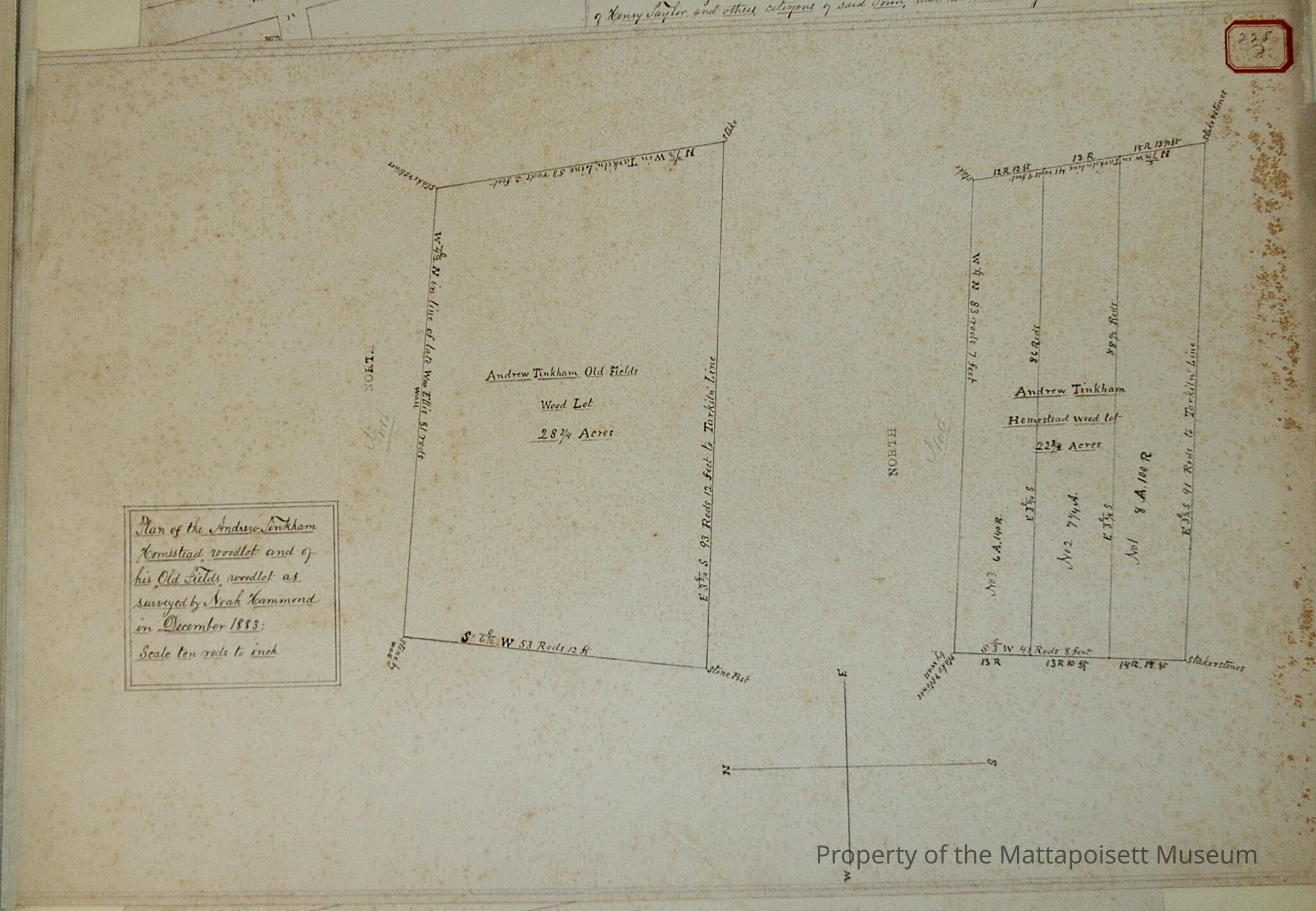 Plan of the Andrew Tinkham Homestead woodlot and of his Old Fields woodlot as surveyed by Noah Hammond in December 1883. Scale ten rods to the inch. 28 ¾ acres. Tarkiln, Ellis abutters. Also Andrew Tinkham Homestead wood lot at 22 ¾ acres, divided into three no. 1 8 acres and 100 rods, no. 2 7 ¼ acres, no. 3 6 acres and 140 rods.Acquisition