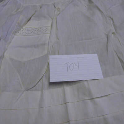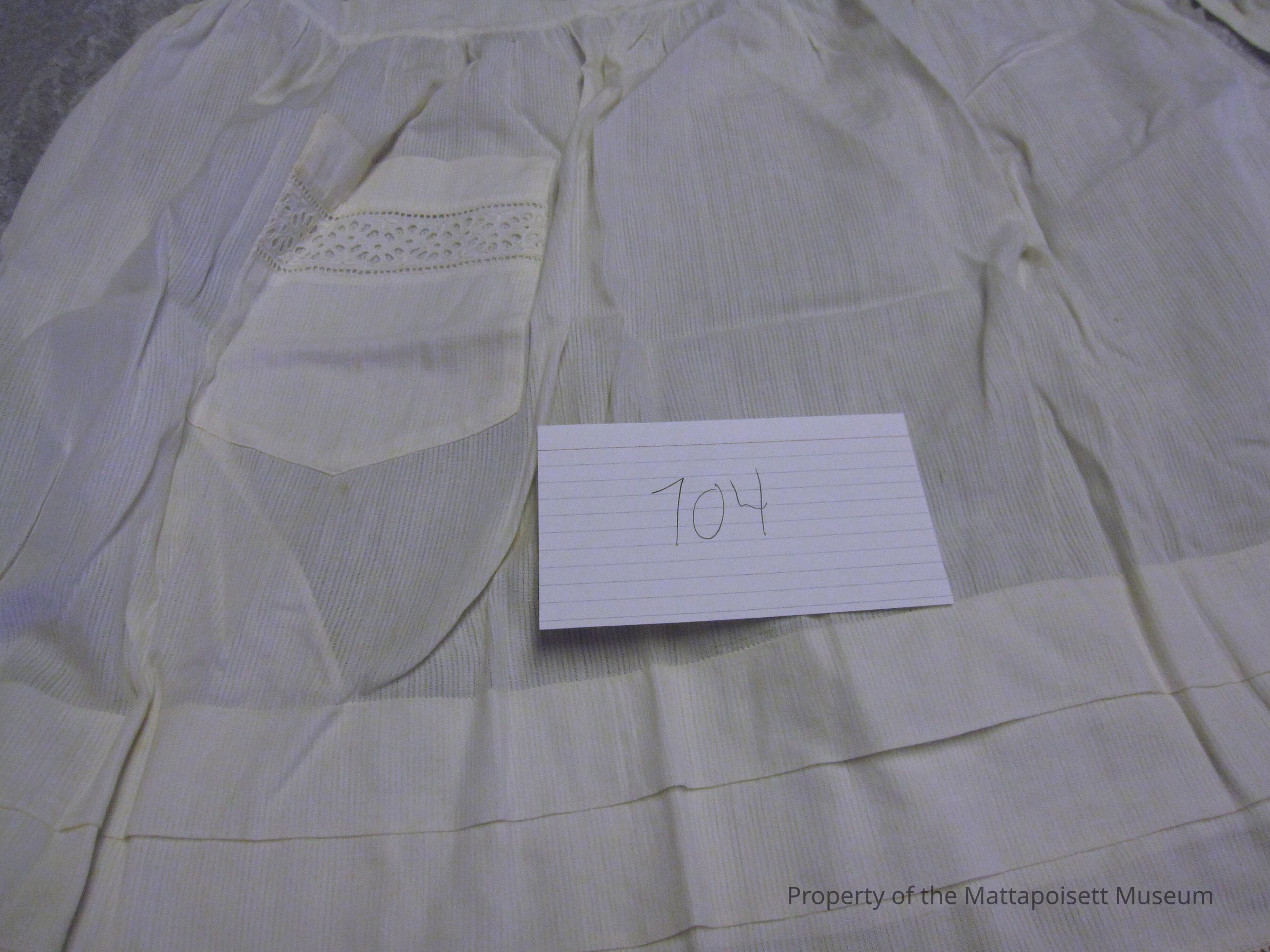 Notes: Notecard: White cotton adult apron with pocket. Cut work on pocket and hem. Two large pleats.