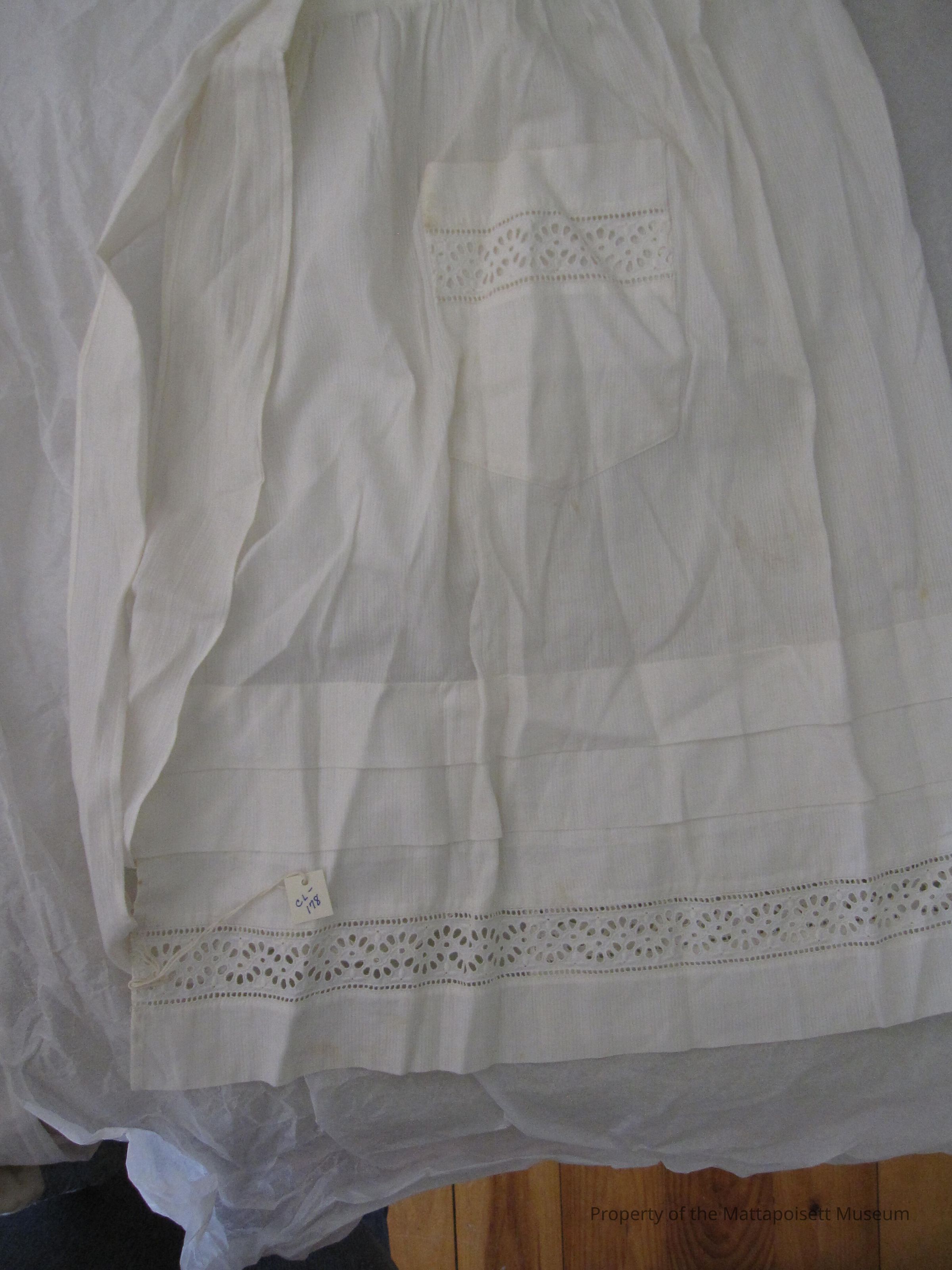 Adult white cotton apron with pocket. Cut-work on pocket and hem. Two large pleats.Collection