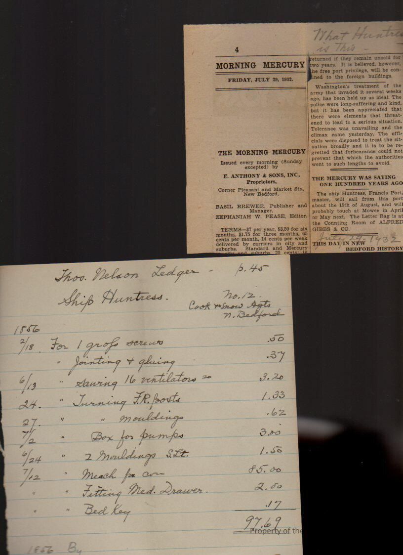 Ship "Huntress", newspaper articles, handwritten notes.Collection