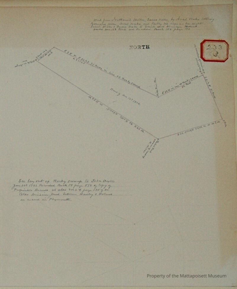 See lay out of Rocky Swamp to John Dexter January 24, 1742. Recorded Book 1st page 578 of copy of Proprietors Records vol. 2 page 195. Also division deed between Hadley and Holmes on record in Plymouth.Acquisition
