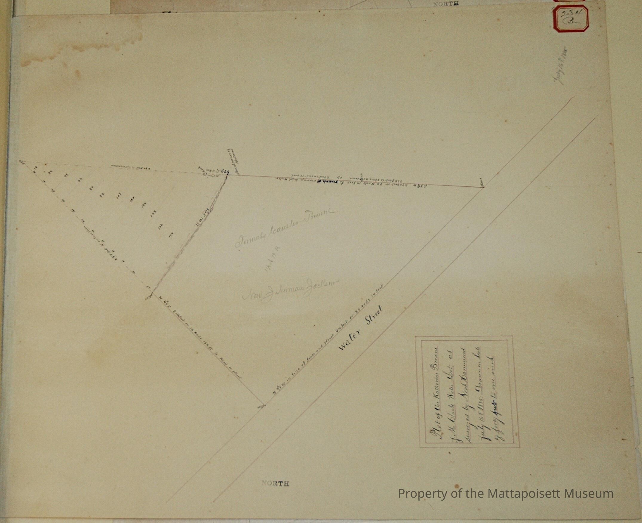 Plot of the Katherine Browne J. M. Clark water lot as surveyed by Noah Hammond July 16, 1885. Drawn on scale of forty feet to one inch. On Water Street. Formerly Causten Browne, now J. Norman Jackson. 1 ½ acres and 19 rods.Acquisition