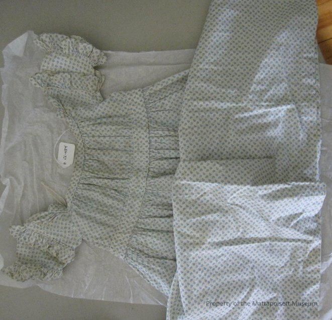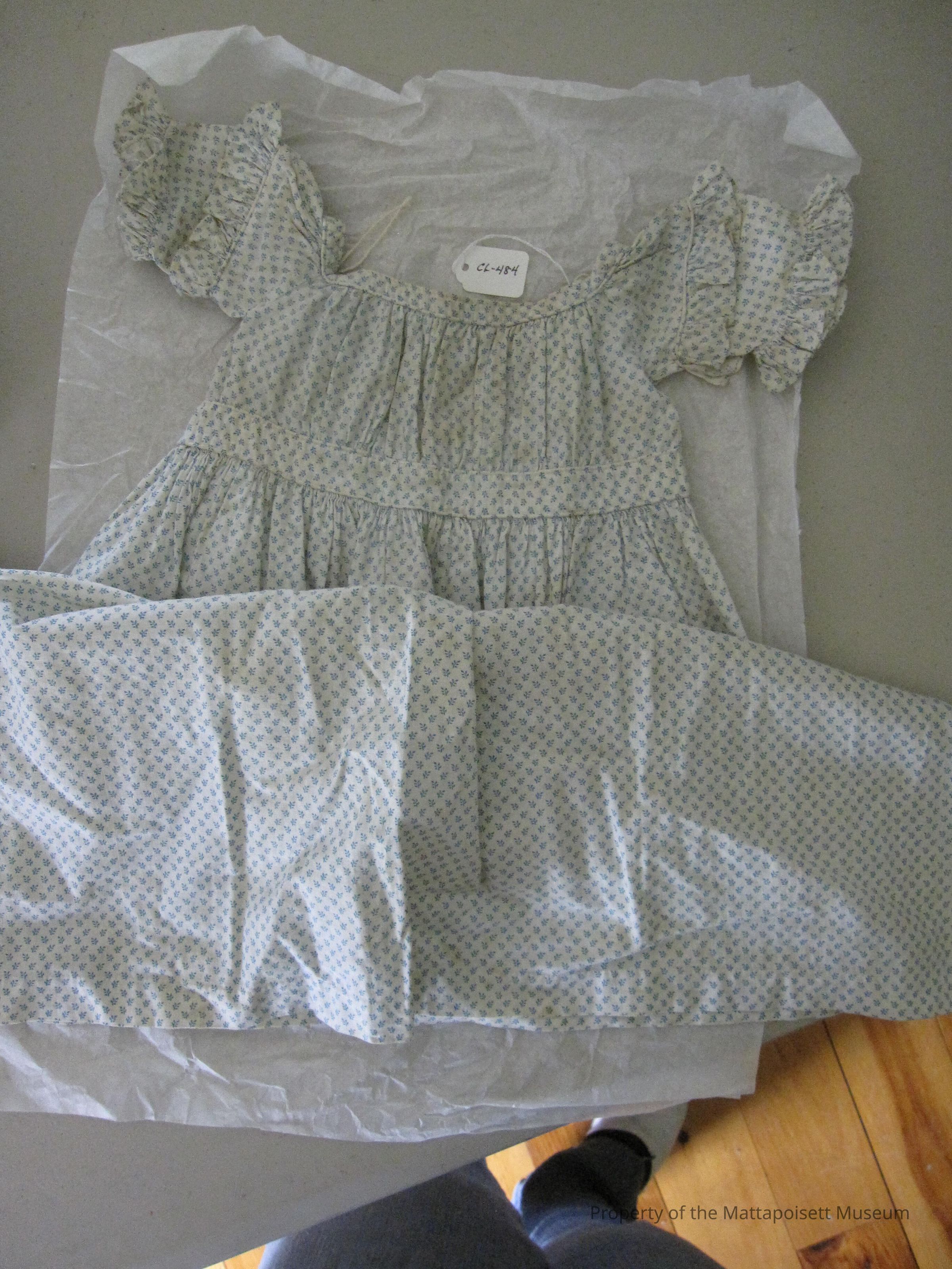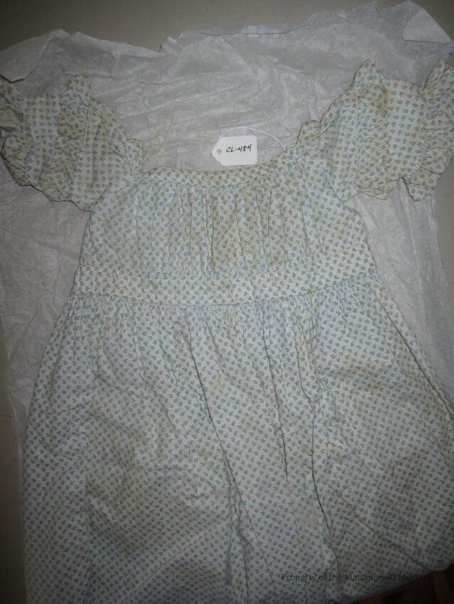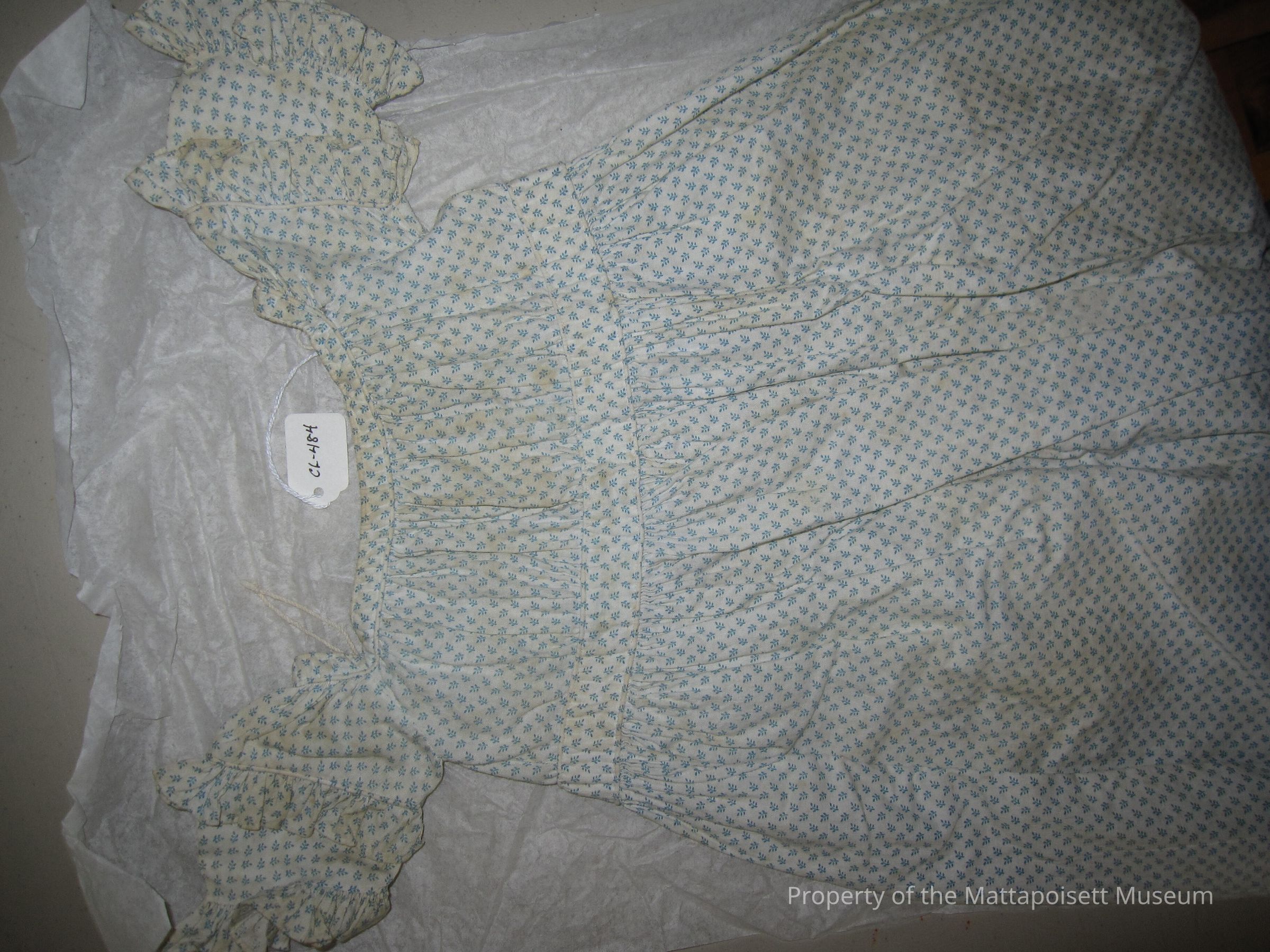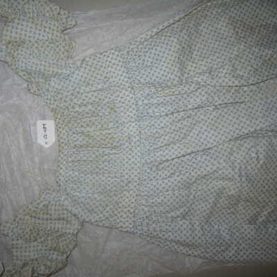 Notes: Notecard: Child's white cotton dress with tiny blue print.