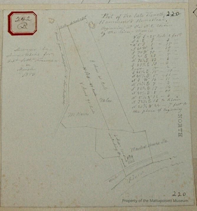 Plot of the late Timothy Hammond's Homestead. Beginning at the northeast corner by the river thence. Surveyed by Ansel Weeks for Capt. Seth Freeman in March 1850. Three lots; Marshal Howes Homestead at 6 acres and 110 rods including the road. M. Howes at 8 acres and 90 rods. Taber at 9 acres and 60 rods. On Road from Mattapoisett to New Bedford and river.Acquisition