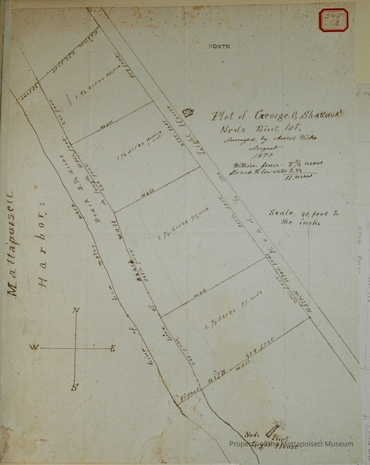 Plot of George O. Shattuck Ned's Point lot. Surveyed by Ansel Weeks, August 1871. Within fence 8 ¾ acres, beach to low water 2 ¼ acres. 11 acres total. Scale 80 feet to the inch. On Road to the Light House, Mattapoisett Harbor. Four divisions 2 1/8 acres 9 ½ rods, 2 7/8 acres and 7 1/8 rods, 1 ¾ acres minus 1 rod, 1 ¾ acres and 54 rods.Acquisition