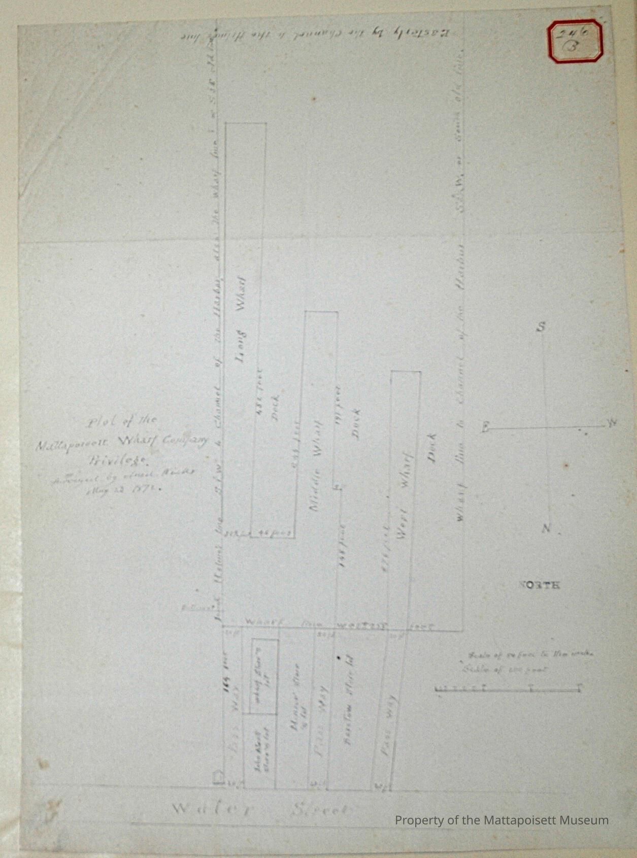 Plot of the Mattapoisett Wharf Company Privilege. Surveyed by Ansel Weeks, May 13, 1872. On Water Street. Scale of 50 feet to the inch. Includes West Wharf, Middle Wharf, Long Wharf. John Atsatt's store and lot, Wharf Store and lot, Barstow store lot, Monroe's store and lot.Acquisition