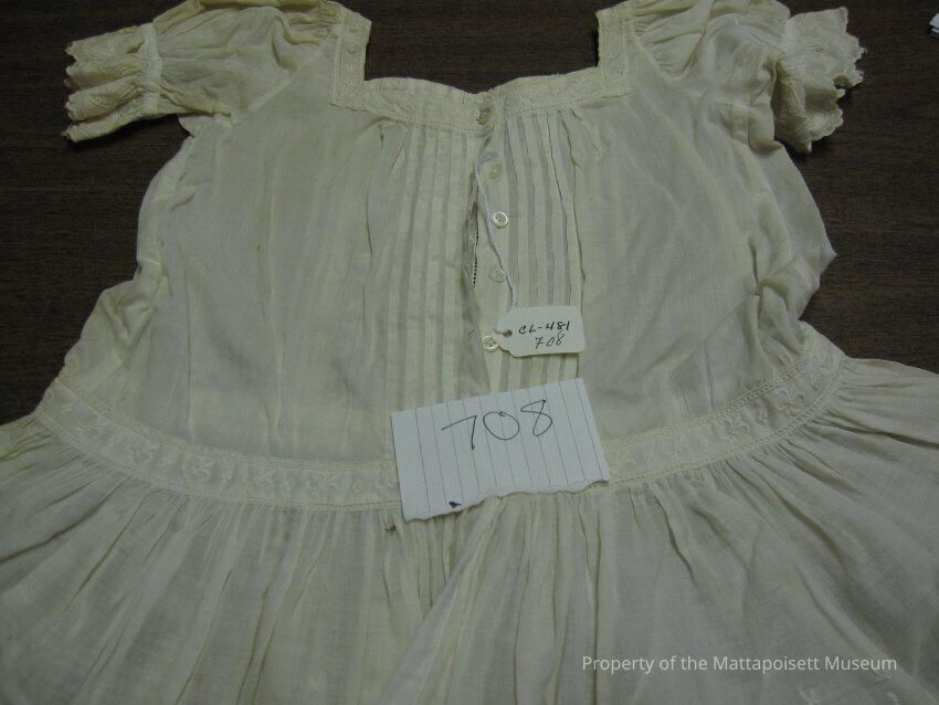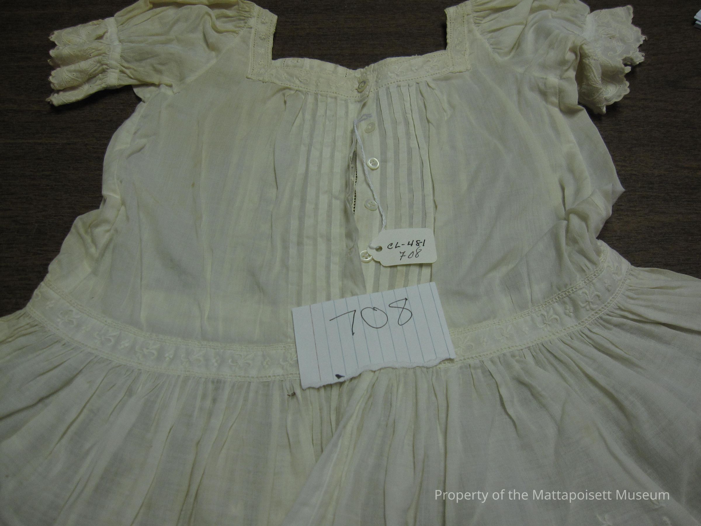 Notes: Notecard: Child's white cotton dress, embroidered trim.