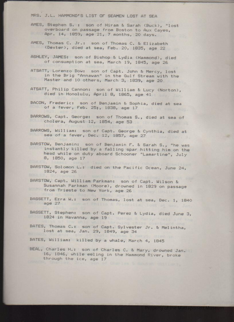Typed list of "Mrs. J. L. Hammond's list of Seaman Lost at Sea".Collection