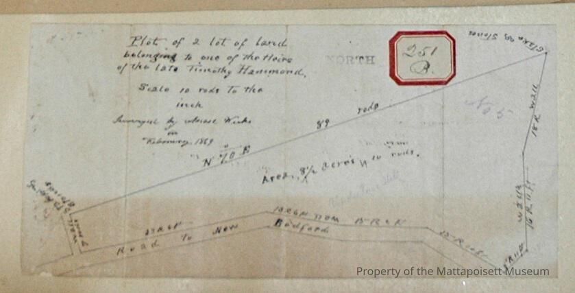 Plot of a lot of land belonging to one of the Heirs of the late Timothy Hammond. Scale 10 rods to the inch. Surveyed by Ansel Weeks in February 1869. On Road to New Bedford. Area 8 ½ acres.Acquisition