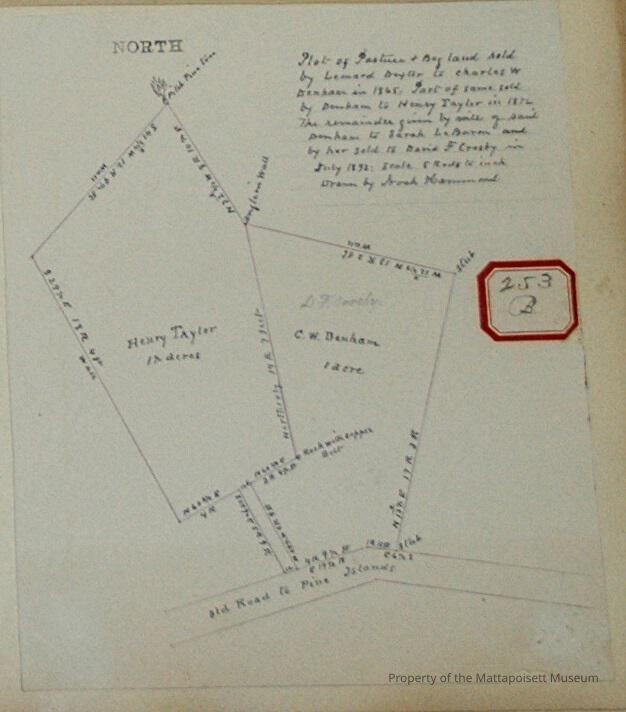 Plot of pasture and bog land sold by Leonard Dexter to Charles W. Denham in 1865. Part of same sold by Denham to Henry Taylor in 1872. The remainder given by will of said Denham to Sarah LeBaron and by her sold to David F. Crosby in July 1893. Scale 5 rods to the inch. Drawn by Noah Hammond. On Old Road to Pine Island. Henry Taylor at 1 ½ acres, C. W. Denham at 1 acre, later D. F. Crosby.Acquisition