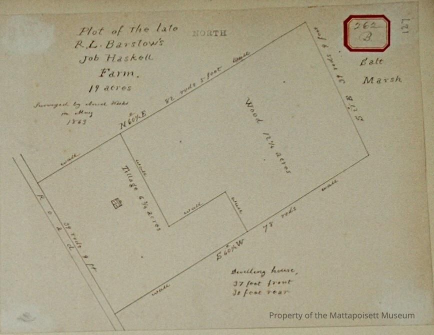 Plot of the late R. L. Barstow's Job Haskell farm. Area 19 acres. Surveyed by Ansel Weeks in May 1863. On road. Dwelling house, 37 feet front, 30 foot rear. Tillage 6 ¼ acres, wood 12 ¼ acres. Salt marsh to east.Acquisition