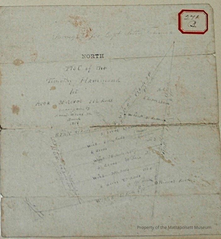 Plot of the Timothy Hammond lot. Area 20 acres 116 rods. Surveyed by Ansel Weeks March 1886. Surveyed for Capt. Seth Freeman. Divided into 5 sections. (1) 6 acres and 57 rods & (2) 6 acres, by William Luce, later by E. & G. H. Dexter (3) 6 acres, by J. M. Washburn, later by E. C. Stetson (4) 6 acres and 27 rods, by E. Buell (5) 6 acres and 23 rods, by J. R. Taber, later by E. B. Hardy.Acquisition