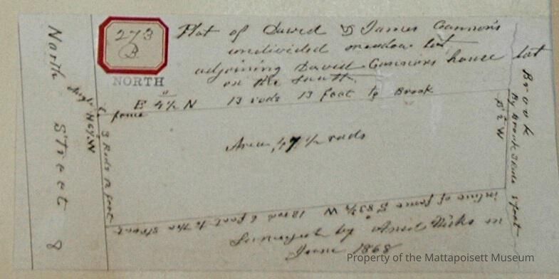 Plot of David and James Cannon's undivided meadow lot adjoining David Cannon's house lot on the south. Surveyed by Ansel Weeks June 1868. On North Street. Area 47 ½ rods.Acquisition