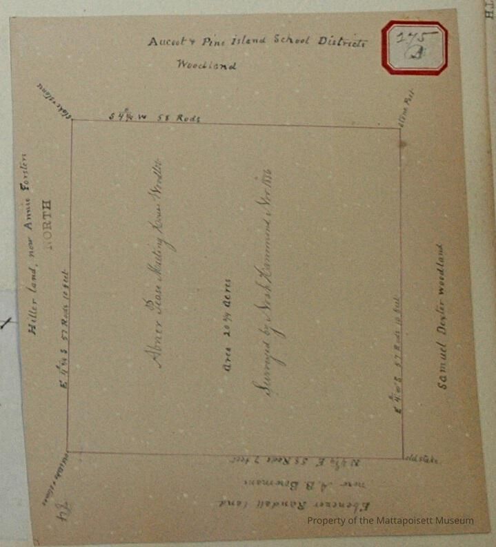 Abner Pease Meeting House woodlot. Area 20 ¾ acres. Surveyed by Noah Hammond November 1886. Samuel Dexter woodlot, Ebenezer Randall land (now A. B. Bowman), Hiller land (now Annie Forster's), Aucoot and Pine Island School District woodland, abutting.Acquisition