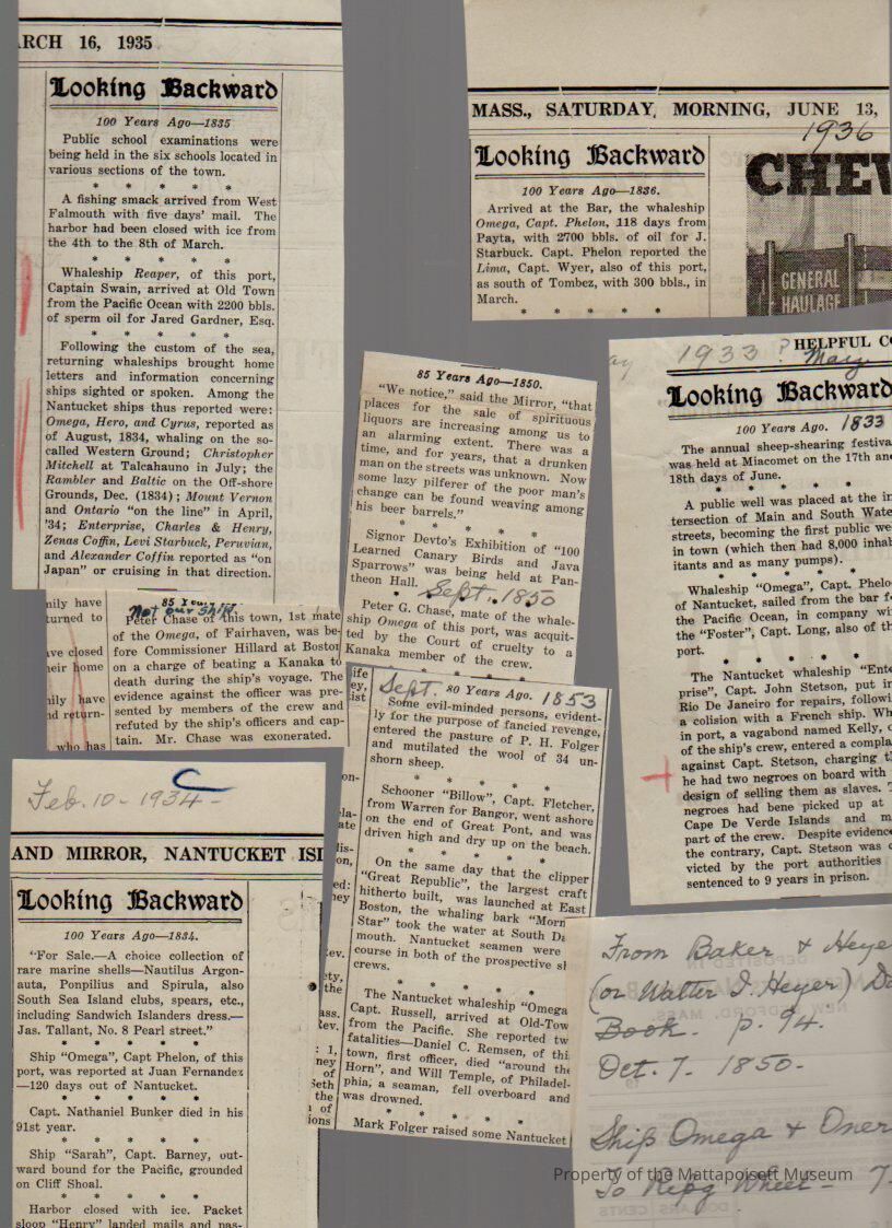 Handwritten notes and newspaper articles about Ship Omega.Collection