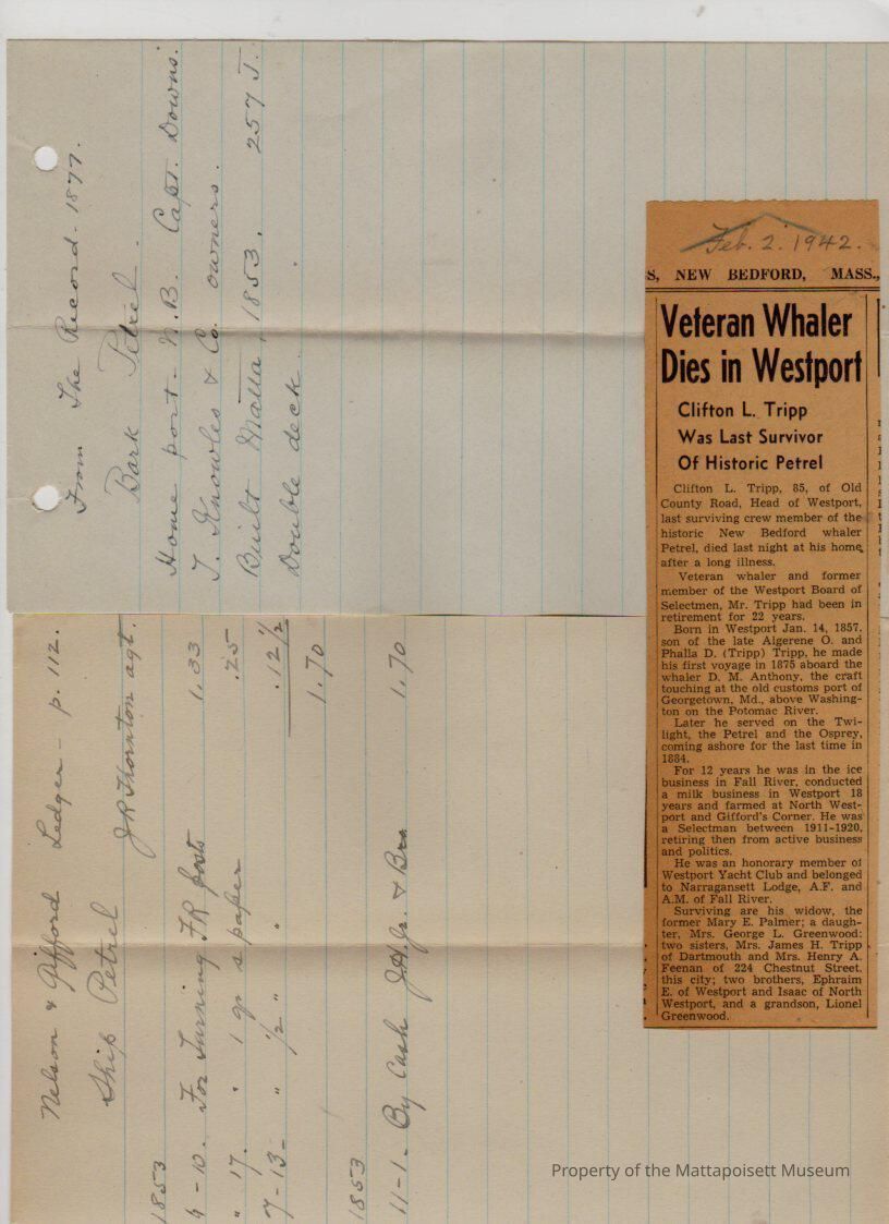 Handwritten notes and newspaper article about Ship Petrel.Collection